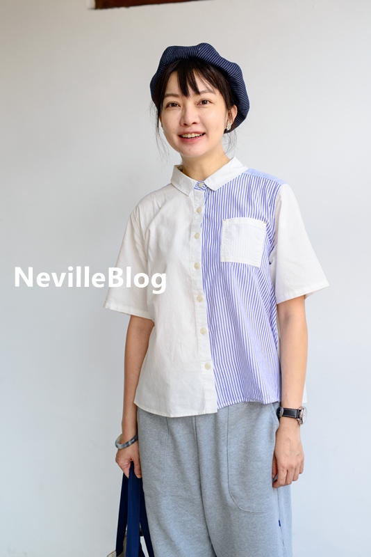 直條紋的貝蕾帽和直條紋的拼接襯衫。